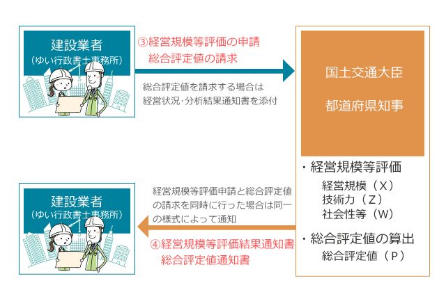 経営状況分析結果通知書を含む必要書類を準備し、国土交通大臣または都道府県知事に対して「経営規模等評価申請」と「総合評定値の請求」を同時に行います。